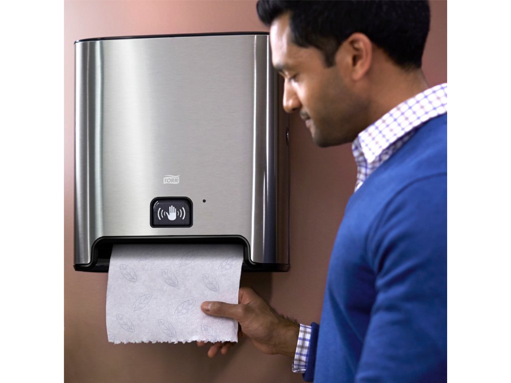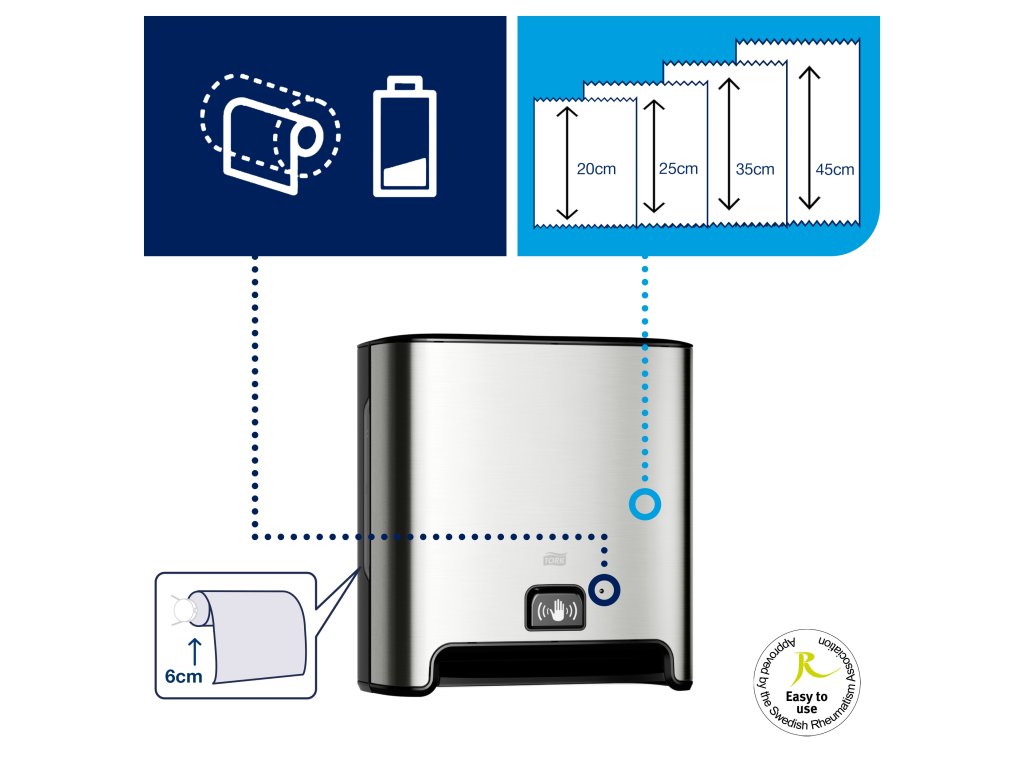 Tork Matic® zásobník na papierové utierky na ruky s Intuition™ senzorom (model 460001), vyrobený z nerezovej ocele, ponúka hygienické a dotykovo voľné dávkovanie utierok s možnosťou nastavenia dĺžky utierky. Tento elegantný a moderný dizajn je ideálny pre vysoko frekventované toalety, znižuje spotrebu a zlepšuje hygienu, pričom je certifikovaný ako jednoduchý na používanie. Vybavený LED indikátorom stavu doplnenia a antinárazovým povrchom, zabezpečuje nízku údržbu a estetiku na úrovni vašich priestorov.