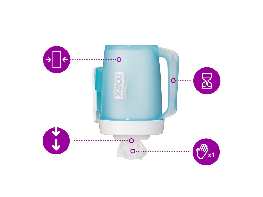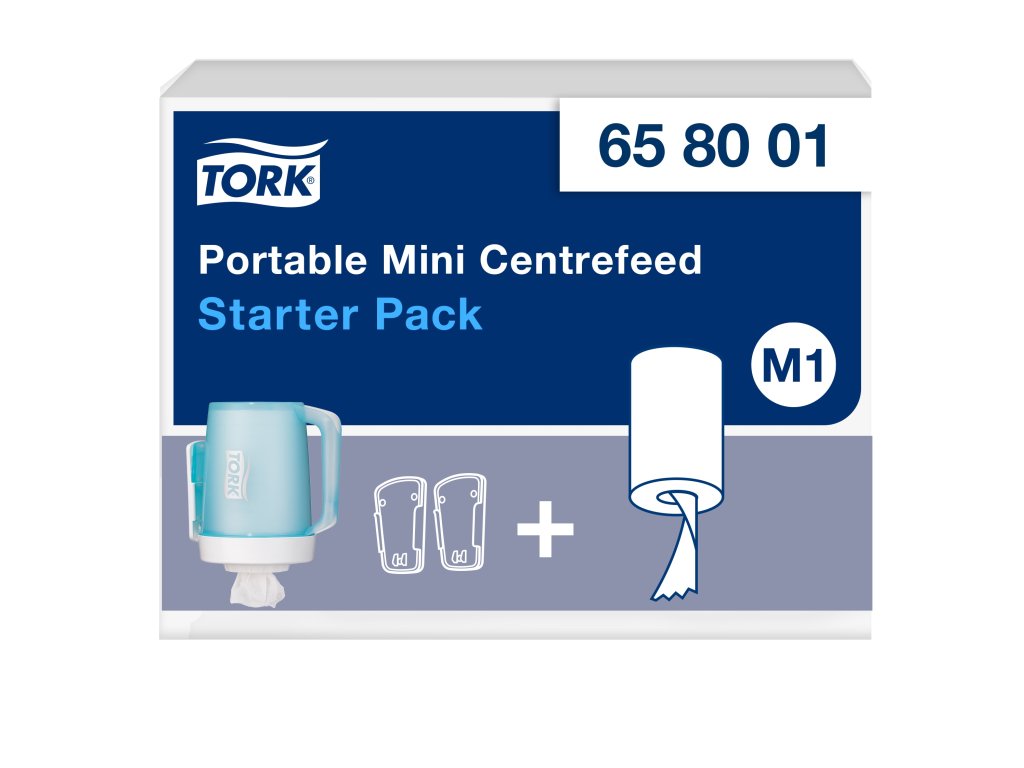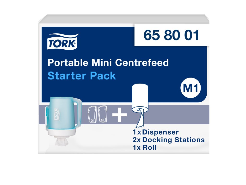 Tork Mini prenosný zásobník na kotúče so stredovým odvíjaním 658001, M1 – Štartovací balíček obsahuje 1 zásobník, 2 dokovacie držiaky a 1 kotúč Tork papierovej utierky Plus (101221). Ideálny pre flexibilné použitie v rôznych prostrediach, zabezpečuje efektívne dávkovanie a vysokú úroveň hygieny.