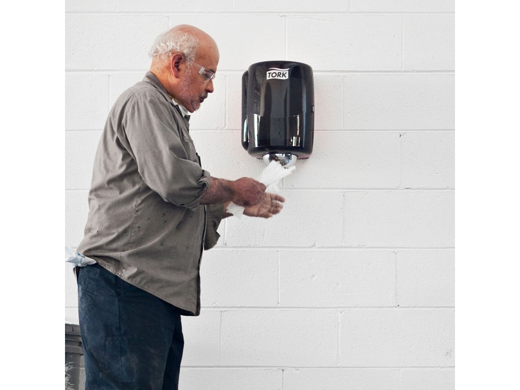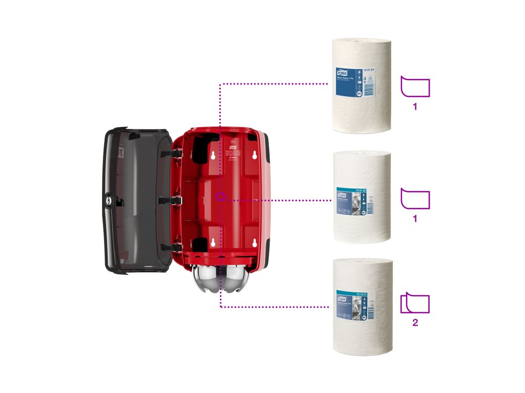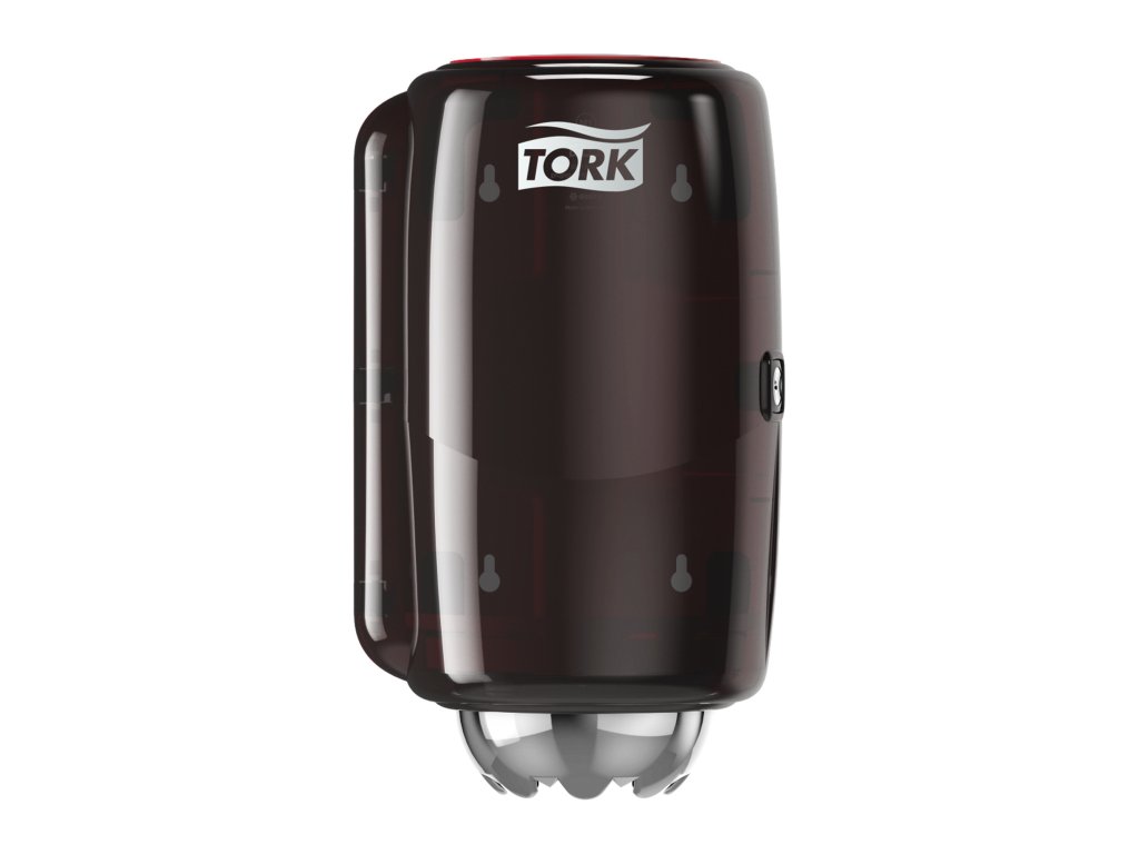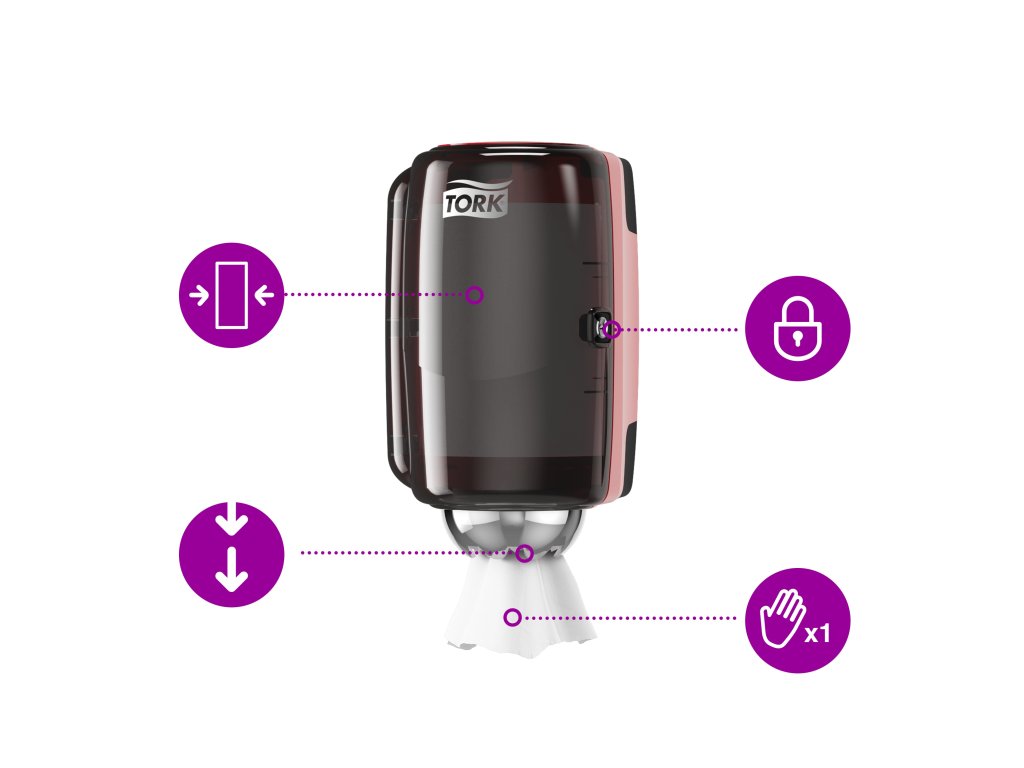 Tork Mini zásobník so stredovým odvíjaním 658008, M1 – Kompaktný zásobník v červeno-čiernom prevedení, ideálny pre obmedzené priestory. Umožňuje efektívne dávkovanie toaletného papiera a zaisťuje vysokú hygienu, čím je ideálny pre verejné toalety a pracoviská.